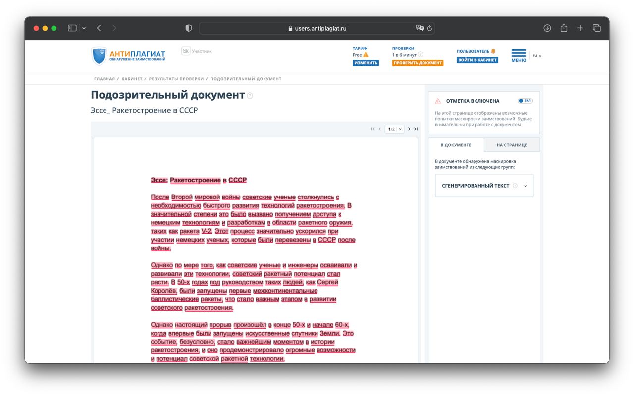 Результат: Система отметила документ как подозрительный и выделила весь текст.