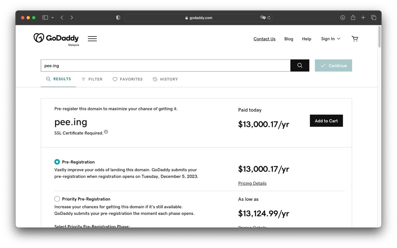 Не удержались и проверили пару доменов. Цены на адреса очень разные: fapp.ing будет стоить $65 в год, за pee.ing придется отдать $13 тысяч в год, а invest.ing обойдется в ежегодные $39 тысяч. Но, не все домены доступны к покупке.