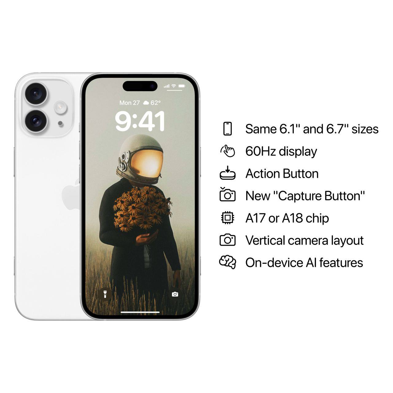 – Частота обновления экрана у iPhone 16 будет 60 Гц, размеры останутся прежними. Экраны у Pro и Pro Max станут больше — 6,3 и 6,9 дюймов. Возможно, у них будут MLA OLED дисплеи.