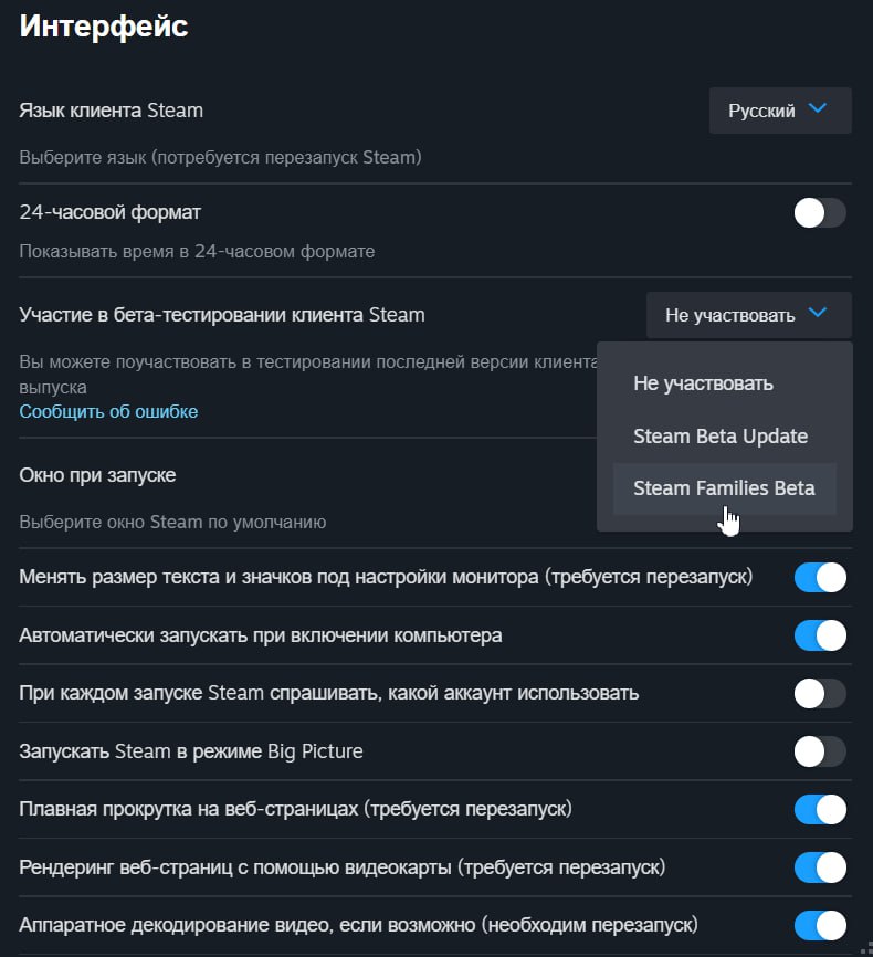 Подключить фичу можно, выбрав Steam Family Beta в настройках интерфейса